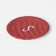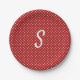 Bolinhas brancas sobre fundo de padrão vermelho de manchas com monograma pessoal.