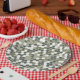 Pratos de festa com padrão moderno com pontos em tons retrô.