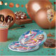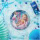 A cute young girl gently drifts on a pink and white unicorn float, gliding across a crystal-clear, blue swimming pool.