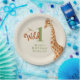 Placas de papel de primeiro aniversario com temas de safari neutro e elegante, com girafa vintage e inseto em fundo de papel vintage. Personalize com seu nome selvagem. Verifique a coleção para coordenar produtos.