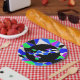 This simple paperplate has an abstract triangle pattern that features purple, blue, and white colors. With an eagle!