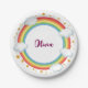 Esta placa de papel divertida apresenta um arco-íris vibrante que forma uma moldura circular para um nome personalizável, acentuado por nuvens fofas e estrelas douradas.