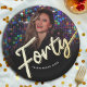 Quarenta dourados afetam placas de festas de texto do script. Personalize esta placa de aniversário com o seu próprio nome de aniversariante e uma foto da sua aniversariante. Estão disponíveis outros anos e itens correspondentes. © Original design por Sarah Trett para www.mylittleeden.com no Zazzle.