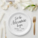Que a aventura comece personalizada e adicione seus nomes e data simples, moderna, elegante, pratos de papel de casamento com fontes manuscritas.