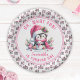 Crie placas de papel personalizadas únicas para a festa de aniversário da primeira menina no tema "Oh, que divertido". Estas placas, cor-de-rosa e branca, apresentam um pinguim giro e giro num chapéu e cachecol de Papai Noel, sentado com um boneco de neve rodeado de verde e ornamentos de férias. A borda está decorada com um padrão. O modelo torna fácil digitar o nome da aniversariante, que é projetado em uma fonte casual de script.