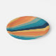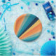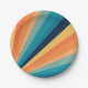 Ilustração geométrica de raios solares de estilo retrô com listras amarelas, laranja, azuis e turquesas