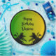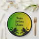 Comece a festa jamaicana com esses pratos de festas jamaicanos. O design apresenta um fundo verde e amarelo esmaecidos, com palmeiras pretas na parte inferior. Todo texto é personalizável