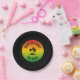 Reggae Music Vinyl registra pratos de festa de aniversário de papel no estilo vinil, com palmeiras de silhueta sobre um centro de raios de sol coloridos. Todo texto é personalizável para você adicionar seu próprio nome e mensagem
