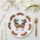 As renas festivas adormecidas com Enfeites de natal e sagradas são acentuadas por poinsetos vermelhos brilhantes e folhas verdes. A design apresenta elementos divertidos que evocam uma sensação de alegria de feriado.