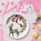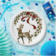 Uma elegante placa de papel de Natal, com uma rena ouro com uma trilha colorida de estrelas douradas, arco vermelho e branco em forma de coroa de Natal. Esta placa de papel de Natal irá adicionar um toque de estilo e talento ao seu entretenimento e jantar de Natal durante a época de Natal.