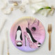 Estas placas de papel feminino são perfeitas para as 16 ou Quinceañera festas ou qualquer evento que comemore os modistas. Bombas de brilho cor-de-rosa com pena de pavão rosa e fundo ombre.