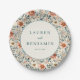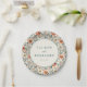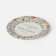 This elegant wedding plate features a vintage-inspired floral pattern with soft pastel colors, including peach, pink, cream, and muted green. The design showcases stylized peonies and delicate leaves arranged in a symmetrical, balanced layout that creates a lush appearance. A central circular frame highlights customizable text in a simple serif font, set against a clean white background for contrast. Perfect for adding a touch of timeless romance to your wedding celebration, this plate combines classic botanical illustrations with modern charm.