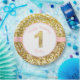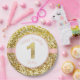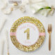 Estas placas cor-de-rosa e do ouro do aniversário são para primeiros aniversários. Têm um fundo do ouro e um ouro sparkly "1" sparkly no centro. Dizem "o feliz aniversario" da sua criança no nome da parte superior e na parte inferior.