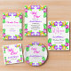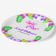 Esta elegante placa de papel de aniversário tropical é perfeita para uma moderna festa de aniversário de verão. O simples design apresenta flores amarelas, roxas e magenta floridas com tipografia colorida elegante sobre fundo branco.