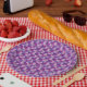Esta placa de papel do partido caracteriza quadrados em máscaras diferentes do roxo e lavanda em um teste padrão pixelated que assemelha-se a 16 gráficos do bocado no video games popular.