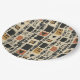 Earthy geometric pattern paper plate inspired by tribal mudcloth textiles, featuring hand-painted rectangles, diamonds, and triangles in charcoal black and terracotta on a textured beige background. A warm boho design ideal for rustic décor lovers, artisan style fans, and anyone drawn to earthy geometric aesthetics.