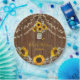 Design bonito, mas rústico, com flores solares pintadas à mão no jarro de mason com iniciais de casal. Cordas de fundo sobre madeira escura antiga. A respiração do girassol e do bebê no fundo. Nome do casal e data do casamento no meio do prato.