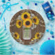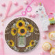 Design bonito, mas rústico, com flores solares pintadas à mão no jarro de mason com iniciais de casal. Cordas de fundo sobre madeira escura antiga. A respiração do girassol e do bebê no fundo. Nome do casal e data do casamento no meio do prato.