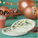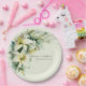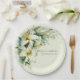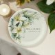 An elegant sage green lily of the valley wedding paper plate featuring Monet-inspired corner watercolor calla lilies and garden plant designs.