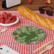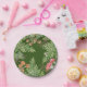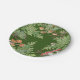 Fernos de aquarela, cogumelos, bagas e pequenas criaturas florestais - um sapo de árvore, ladybug e abelha, circundam estas bonito placas. Perfeito para qualquer estação, e o verde sugere primavera. Placas de piquenique de excelente. Os cogumelos silvestres, um assunto popular, agregam interesse e cor. Esta design de bosque tem um fundo verde escuro. Arte original e design de Tuzi Williams.