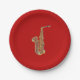 Design com ilustração do saxofone em fundo vermelho; elegante design de instrumentos musicais simples de jazz