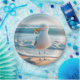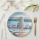 Uma gaivota bonita numa praia com batatas fritas na costa.