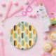 A seamless geometric pattern features vertical, oval shapes in soft yellow, teal, peach, orange, and brown, creating a retro, playful vibe.