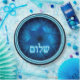 Um design elegante com textos brilhantes, azuis e brancos, em hebraico, que diz "Shalom" (ש ל ם - paz) sobrepôs-se a uma imagem fractal, azul e gravada de uma Estrela de David.