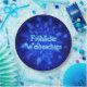 Um enxame de flocos de neve fractais azuis. O texto alemão que lê "Froliche Weihnachten" aparece em azul e branco brilhantes.