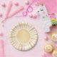 Este design alegre de prato de papel apresenta um clássico sol aquarelado no centro, com raios quentes em tons de amarelo e laranja para um visual suave e atemporal. O estilo pintado à mão lhe dá um toque suave e divertido que funciona lindamente para uma variedade de celebrações. Quer você esteja planejando um chá de bebê “Pequeno Raio de Sol” ou “Aqui Vem o Filho”, um aniversário de “Primeira Volta ao Sol”, ou simplesmente queira adicionar um clima alegre de verão à sua festa, este design traz um toque brilhante e alegre à mesa.