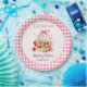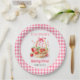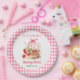 Basket with strawberries, hearts and pink bow Berry First Birthday paper plates. These 'Berry First Birthday' paper plates present a delightful scene: an overflowing basket bursting with vibrant red strawberries. The design is sweetly enhanced by whimsical hearts and a delicate pink bow tied to the basket's handle. The 'Berry First Birthday' text is prominently displayed below, all encased within a crisp white square frame and finished with a bold hot pink and white gingham border.