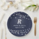 Sua noiva e noiva favoritas amará esta placa de papel personalizável, com seu dia de casamento ou aniversário! Cordas de luzes brancas rodeiam um monograma, nomes de casais e data de casamento ou outra ocasião especial. Você pode alterar a cor de fundo do marinho clicando no botão Personalizar. Faz um lindo, moderno, acessório partidário personalizado.