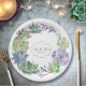 Fontes únicas, suculentos coloridos de aquarelas e fundos brilhantes em um primavera verde macio são os destaques desses produtos de casamento misturados e combinados. Esta placa de papel impressionante tem uma grande camada de folhagem em um fundo branco com um modelo fornecido para editar as iniciais da noiva e do noivo e a data do casamento na etiqueta central. Procure ID515 para ver todos os produtos correspondentes neste conjunto.