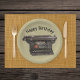 Esta placa de papel tem uma imagem de uma máquina de escrever preta manual antiga, antiga, sobre um plano de fundo marmoreado, de cor preta. Personalize o texto de aniversário feliz com os modelos.