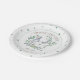 Pratos personalizados tema festa de primavera para chá de bebê no quintal ou festa de aniversário. Este design apresenta uma borda de bolinhas em verde sage com coelhos cercados por uma coroa de louro de botânicos. Personalize com o nome da futura mamãe e data do chá. Para ver a decoração de festa tema Páscoa correspondente visite www.zazzle.com/dotellabelle