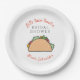 Este prato de papel para chá de noiva com tema de festa apresenta um taco com a frase "Vamos falar de um chá de noiva taca" em preto e laranja. Suprimentos para festa combinando disponíveis.