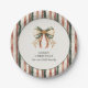 Pratos de Papel Tiras Rústicas com Laço de Natal Personalizados Feliz Natal... Padrão de listras rústicas coloridas em tons de vermelho, verde e dourado para os pratos de papel da sua festa de Natal. Guardanapos combinando também estão disponíveis. Um laço de Natal nas cores correspondentes é apresentado acima do texto de exemplo para sua saudação de Natal e nome individual ou da família. Todo o texto pode ser facilmente revisado no modelo de personalização.