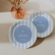 Um tema moderno com estilo retrô. Adicione um toque final elegante à sua festa de despedida de solteira com tema costeiro com estes pratos de papel "Última Tosta na Costa" azuis e brancos chiques. Todas as cores (listras, arco de fundo, ícones e, claro, cores da fonte) podem ser editadas por você dentro da ferramenta de design).
