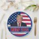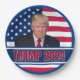 O Partido Trump 2024 Plates Donald Trump com a bandeira americana atrás dele, Trump 2024 esboçado em branco na parte inferior. Chapa de borda azul.
