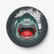 Ondas caem atrás da cabeça de um tubarão pulmonar, boca aberta, cheio de dentes afiados. Excelente de comer salgadinhos durante a Semana do Tubarão!