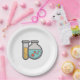 Chapas de papel com uma ilustração fofinha de um tubo de ensaio que contém um líquido amarelo e um balão/copo arredondado que contém um líquido verde com bolhas vermelhas.