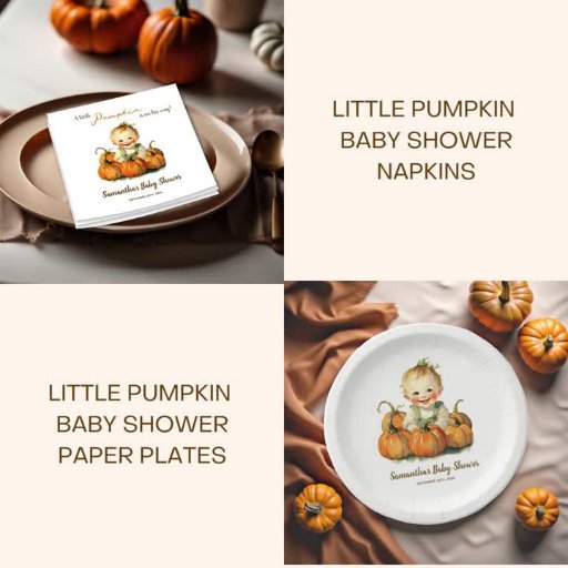 Chapas de papel simples e elegantes para chás de fraldas, com desenho de aquarela de um bebê sorridente e giro cercado por belas abóboras. Você pode personalizar estas lindas placas de papel com seu próprio texto.