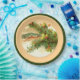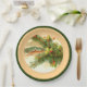 Placas de papel com uma cena de safra de uma imagem de Natal de 1909 com flores de laranja e ramificação de pinheiro.
