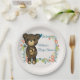 Uma placa de papel de chá de fraldas (ou outro evento). Projetado com uma ilustração fofinha de um ursinho marrom de desenho animado segurando uma margarida amarela. Cercada por uma coroa floral decorativa com flores, folhas, prigos e corações. Esquema de cor do outono.