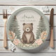Este adorável design de floresta florestal apresenta um urso marrom giro cercado por florais e árvores.