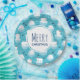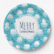Chapas de papel com um lindo padrão de Natal, com ursos polares em pé sobre gelo flutuante vestindo chapéus de anã vermelhos. Pequenos iglos, flocos de neve e peixes cercam esses adoráveis ursos polares se resfriando na água. Fundo azul claro. Design de férias bonitas e caprichosas. Feliz Natal escreveu dentro um círculo branco.