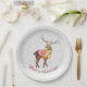 Grande veado com flocos de neve e cachecol de inverno e texto vermelho Feliz Natal em fundo de floco de neve prateado.