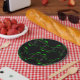 Placa de papel festeiro incomum com um padrão excêntrico de armadilha de Vênus em preto e verde.