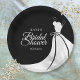 Um prato de papel chique para chá de noiva com um vestido de noiva elegante em fundo preto e um texto em escrita branca para os detalhes do seu chá de noiva. Criado por Thisisnotme©