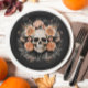 Chapas Elegantes de Halloween, com um crânio de colheita rodeado de rosas de pêssego e folhagem escura, sobre fundo de carvão. Uma escolha impressionante para as mesas góticas, festas de janto assustadoras ou casamentos de Halloween. Coordena-se com guardanapos, rótulos de vinho e outros suprimentos de fatias de crânio para um conjunto completo.